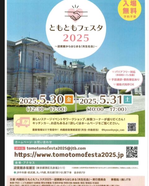 内閣府主催の「ともともフェスタ2025〜迎賓館からはじまる共生社会」を視察 2025年5月30日 最終更新日時 : 2025年5月30日 Webサイト管理者 迎賓館赤坂離宮で行われている、内閣府主催の「ともともフェスタ2025〜迎賓館からはじまる共生社会」に行ってきました!障害のある人もない人も共に楽しむことで相互理解を促進するためのイベントです。 詳細は、内閣府HPをご覧ください。 31日までです。 あいにくの雨☔ではありましたが、私がお邪魔した時は、ステージでのお笑いライブがとても盛り上がっていました #内閣府 #ともともフェスタ2025 #生稲晃子
